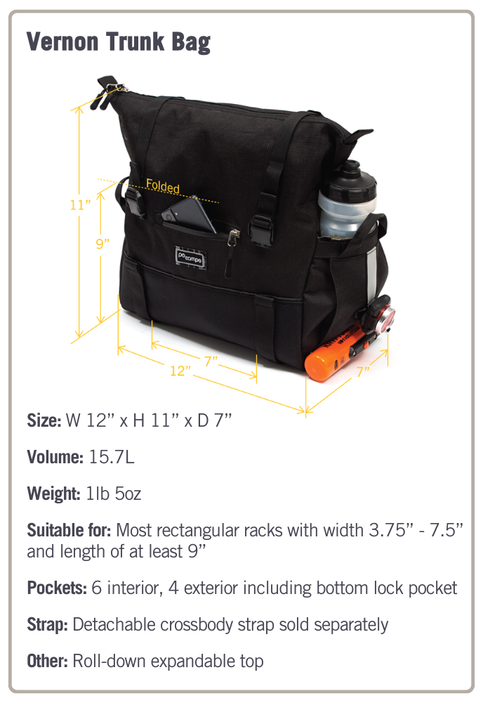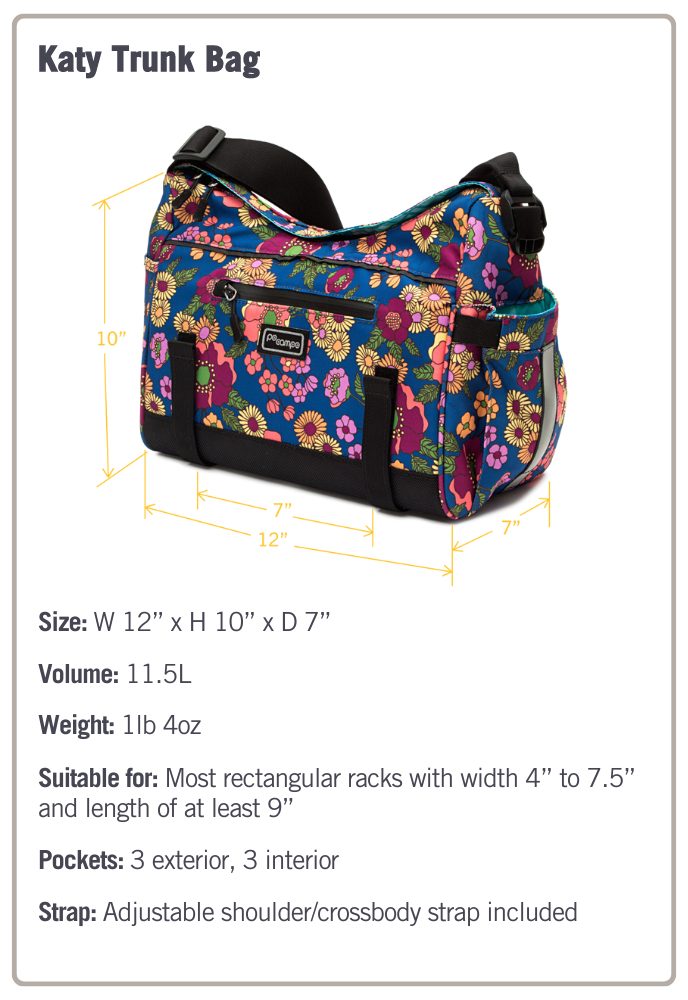 The Katy Bike Trunk Bag footprint works with most rear racks, including ebikes, and her four industrial-strength velcro fasteners will withstand years of daily use.