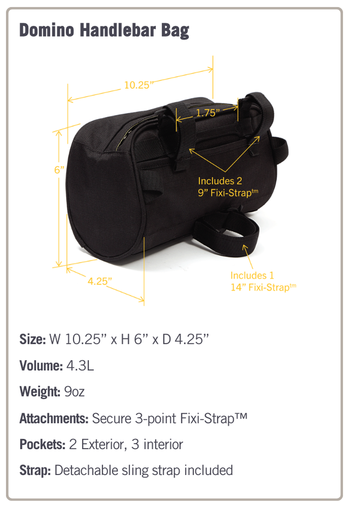 The essential handlebar bag, upgraded for extra versatility. Quickly grab your gear and hit the road with the lightweight Domino Handlebar Bag, which easily and securely attaches to all handlebars with a 3-point attachment system. With water-protected zippers, detachable sling strap, and plenty of pockets, this bag will become your go-to for all your rides.