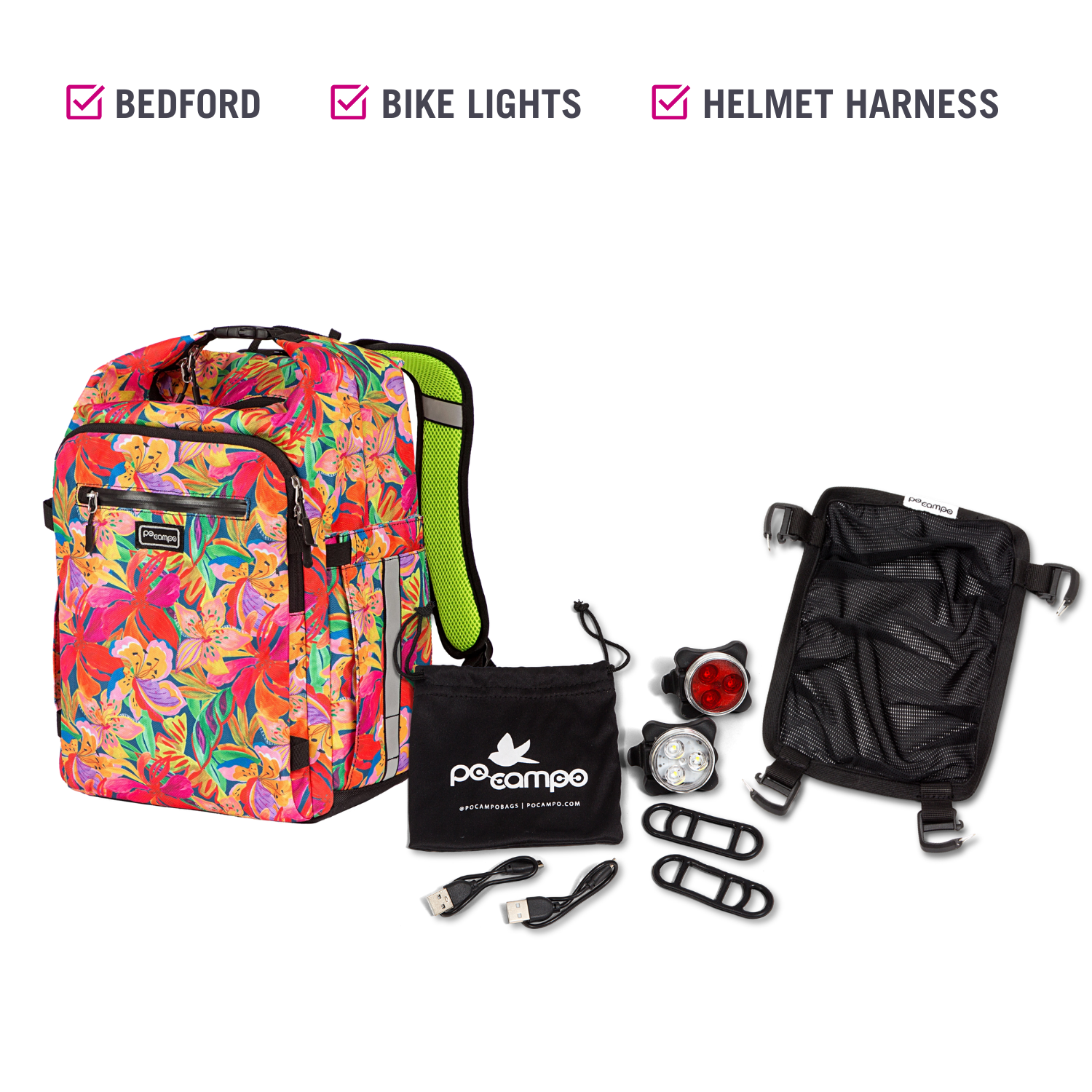 - 1x Bedford Backpack Pannier in Black Ripstop. The Bedford holds everything you'll need throughout your day while securely attaching to the rear rack of your bike (e-bikes too!) and converting into a comfortable backpack when you're off the bike.